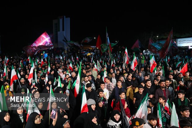 مشهد- مردم مشهد در شب پنجاه و دوم در تجمع بلوار احمدآباد لانچر و موشک آوردند.